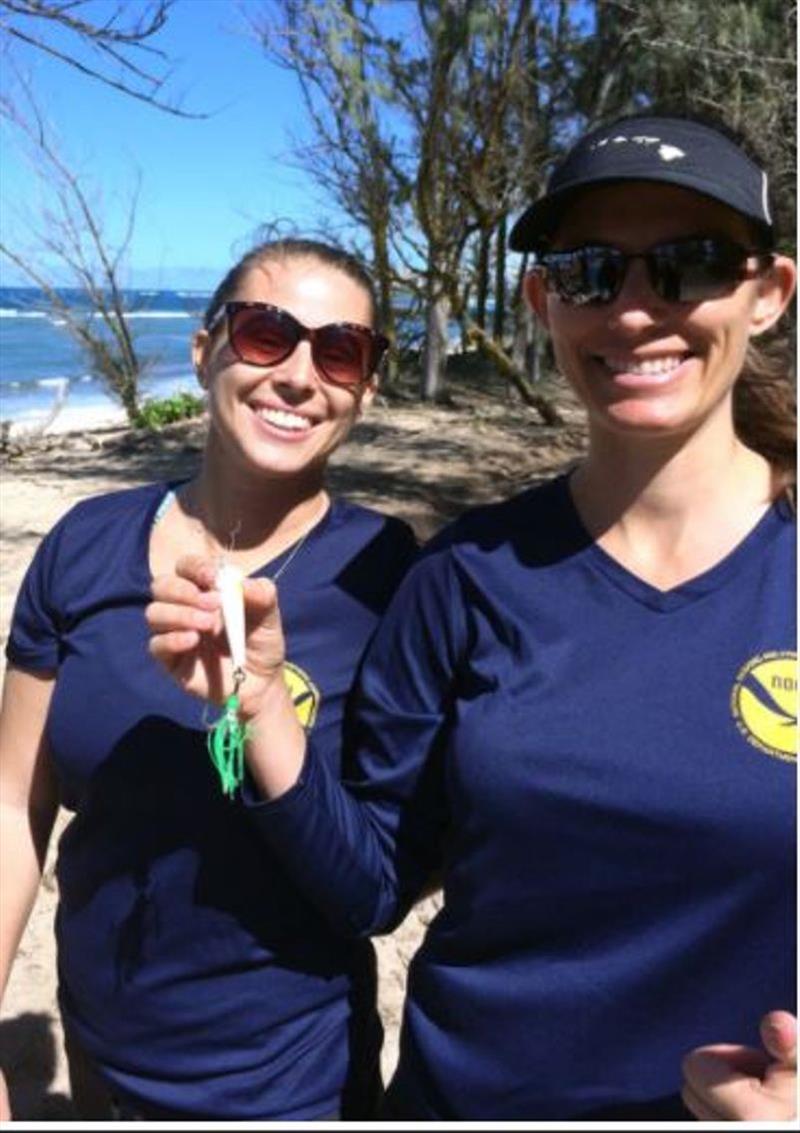 It was too late for a safe response that night, so the HMAR team monitored the area throughout the weekend, until they finally spotted Kaimana hauled out at a sandy beach on Sunday afternoon. A NOAA team responded and safely restrained the seal, and then they removed the lure within minutes.