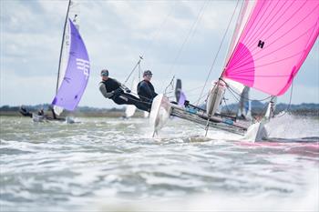 It was decided that we might try for four races as Sunday's wind was not looking great. Ben Harris from Weston SC and his first time Hurricane crew Marcus King- swiftly drafted in from the Nacra 15 circuit, did a great job in race one. The pairing; slim, fit, underweight - all the things us older beer bellied chaps are not, just took off in the earlier lighter breeze.