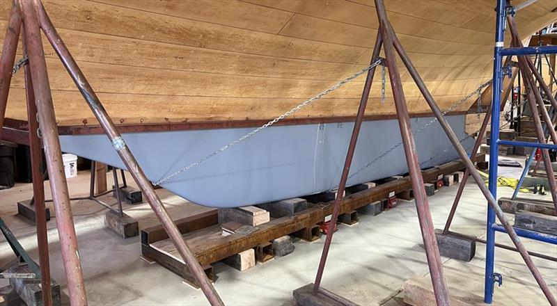 Here are a couple of photos showing the keel in place beneath the hull, being prepared for installation and positioned to support the century-old yacht as it enters a new chapter of performance and elegance.
