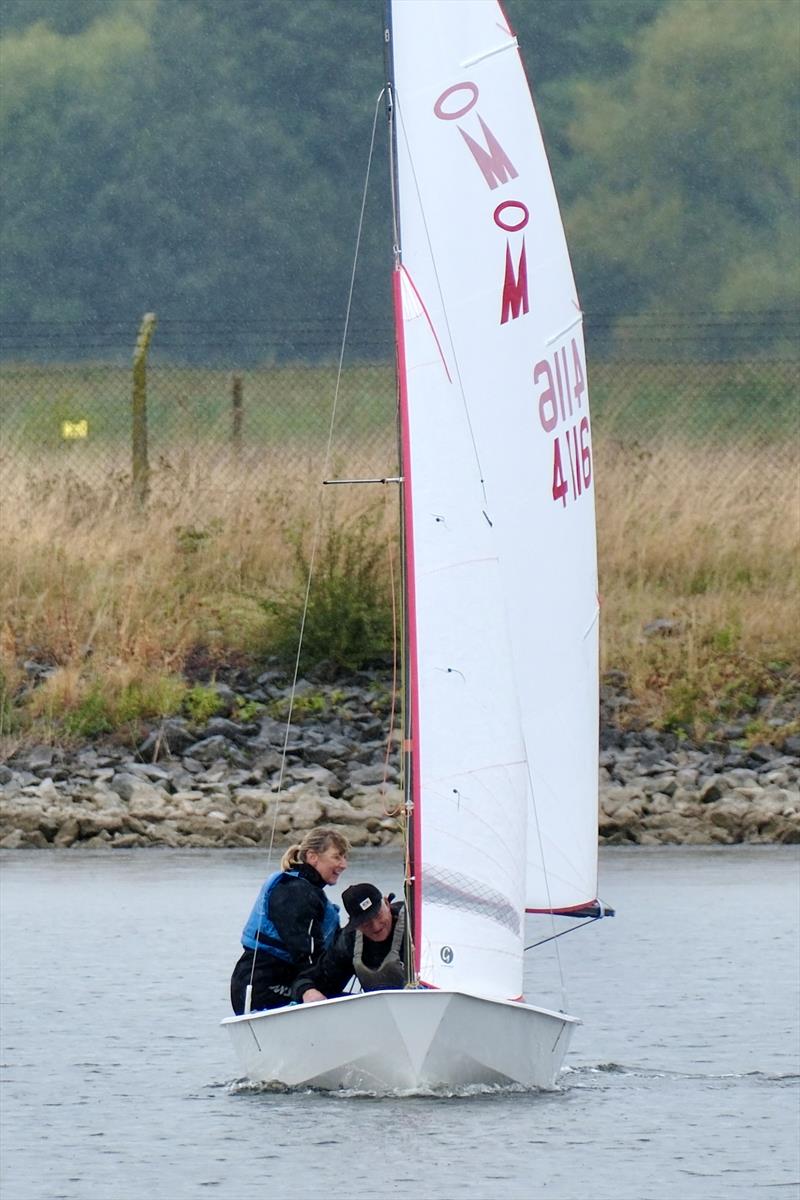Most were reluctant to leave the clubhouse for race 2 as the predicted forecast of heavier rain had begun. Nevertheless, all the boats got off to another smooth start and were soon jostling for position around the windward mark. Whilst racing they could almost forget the rain, but spare a thought for the race team, with little cover, especially those on safety.A big thank you to Jonathon Edwards and Simon Dolman on race duty and an even more appreciative one for Mark Roberts and James Stark on safety. Once again Dave and Zara were first round the windward mark, followed by Wayne and Angela who showed their experienced Miracle skills in the freshening breeze. These two boats kept their positions for the 4 laps. In the following group of Shotwick sailors, the non-spinnaker boat with Gaz and Claire were ahead of Mark and Sara and Dave and Shan. These three boats battled as positions changed on the lake and the persistent rain became a deluge. Crews were trying to hand bail as water rose in boats, but still they raced on. After 53 mins, Dave and Zara crossed the line followed by Wayne and Angela with Mark and Sara in 3rd place.