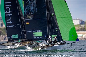 Following an extension of the outer windward course to avoid further startling issues, race 5 saw a stiffening breeze reaching 18-20 knots. A number of tiring crews took a dip, some more than others, and all were glad to take a breather afterwards as the Brittany Ferry entered the Sound dead on 1330hrs. Once cleared the Nacra 15s and fast handicap fleets were sent out around the breakwater once again for the last race of their series.